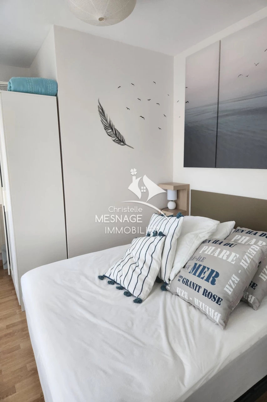 À louer chez Christelle Mesnage : DINAN CENTRE-VILLE - Au 3ᵉ étage avec ascenseur, bel appartement T2 meublé de 49,43 m² loi carrez avec terrasse, comprenant : Une entrée, un séjour avec balcon, une cuisine équipée. En demi niveau : un palier, un wc, une chambre avec salle de bains. Au-dessus, en demi-niveau : une belle terrasse avec vue dégagée et un coin rangement, un parking en sous-sol et une cave. Appartement propre et lumineux.